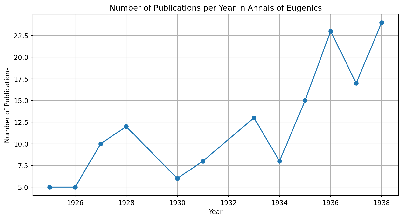 plt.title("Number of Publications per Year in Annals of Eugenics")
