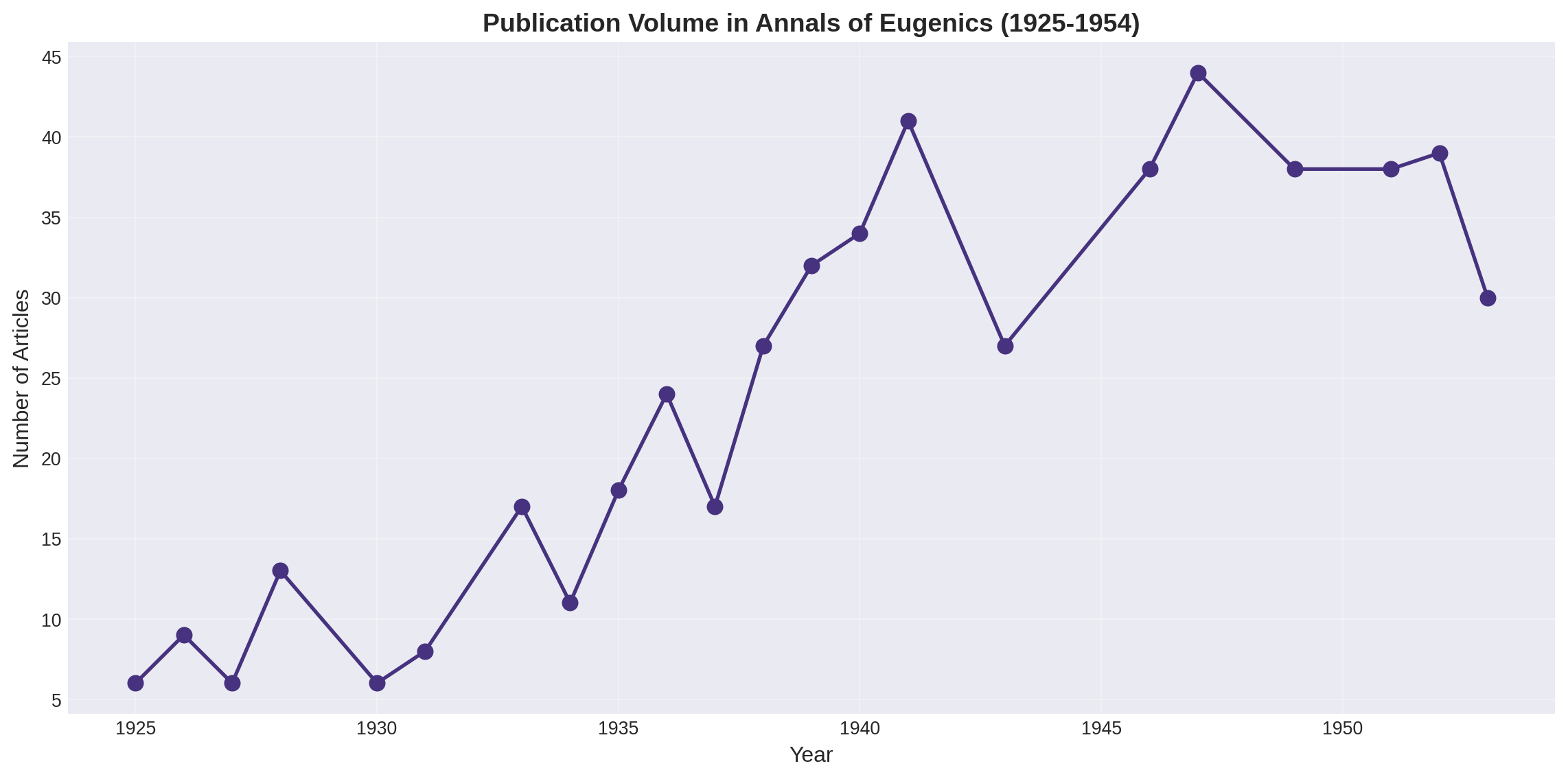 Data Source: The Annals of Eugenics online archive Collection Method: Web scraping using Python (BeautifulSoup, requests) Time Period: 1925-1954 (Volumes 1-18) Data Points: Article titles, authors, publication dates, volume/issue numbers