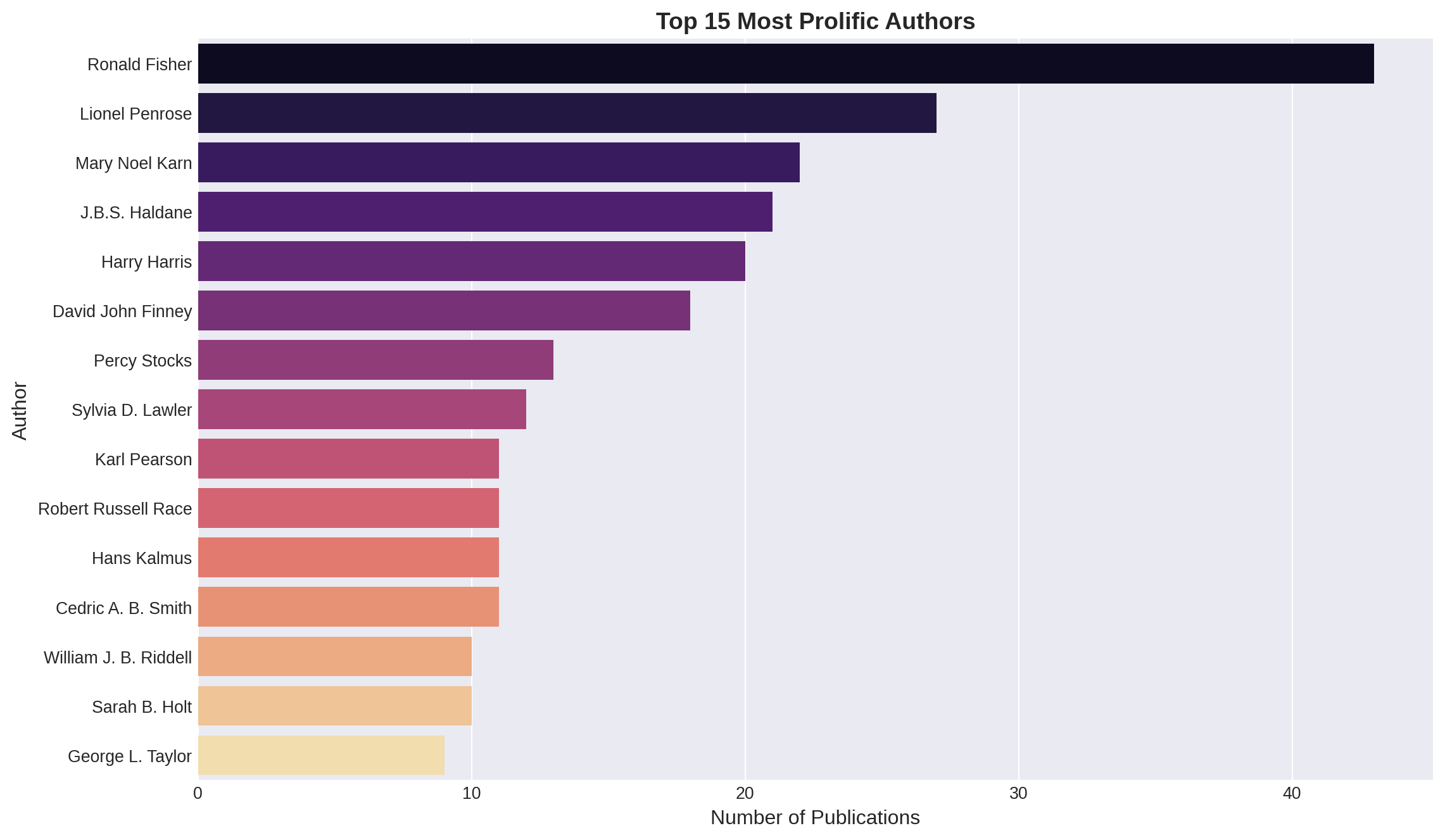 plt.figure(figsize=(12, 7))sns.barplot( x='count', y='Author Name', data=df_top_authors, palette='magma')plt.title('Top 15 Most Prolific Authors', fontsize=14, fontweight='bold')plt.xlabel('Number of Publications', fontsize=12)plt.ylabel('Author', fontsize=12)plt.tight_layout()plt.show()