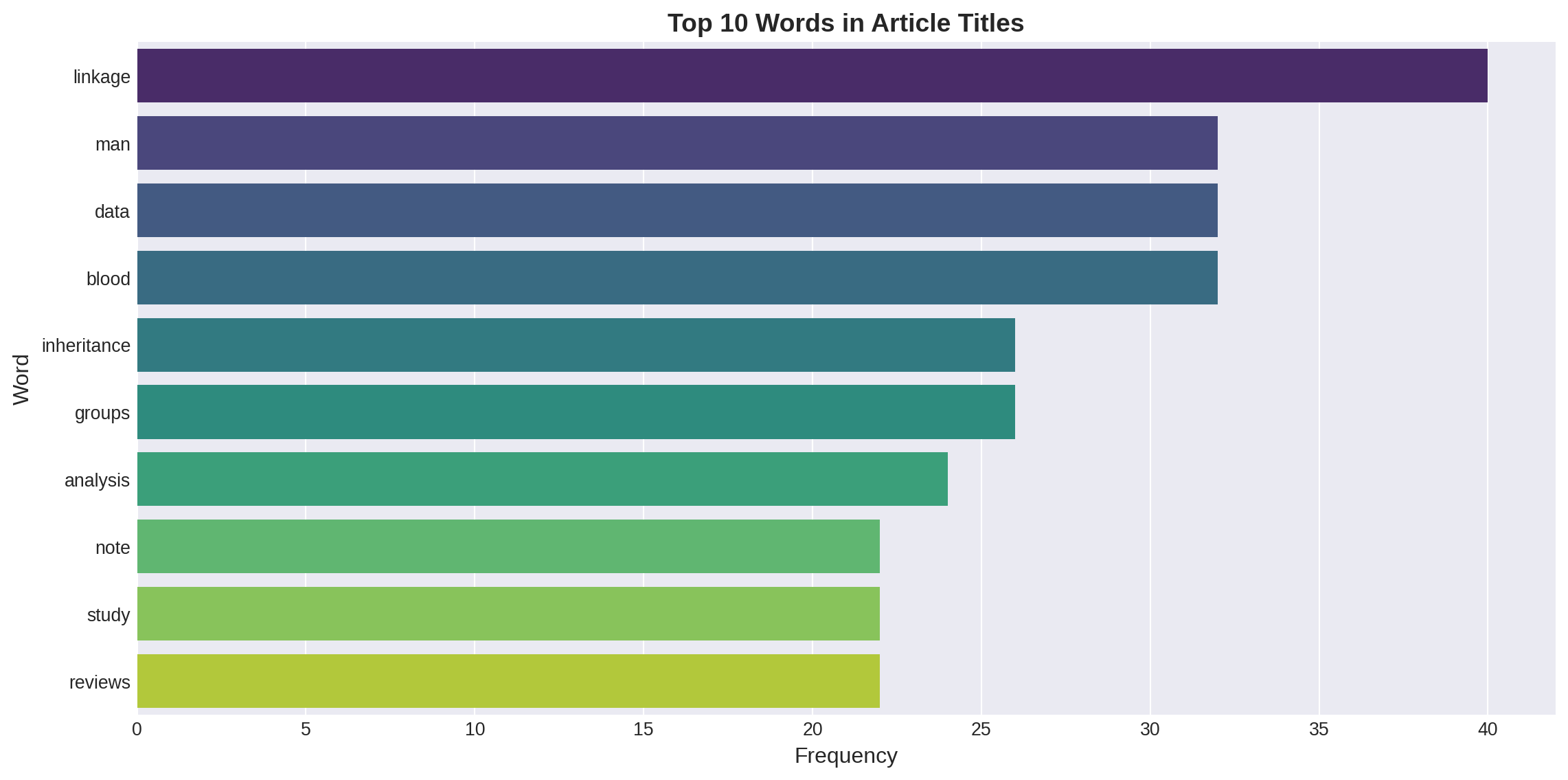 plt.figure(figsize=(12, 6))sns.barplot(x='Frequency', y='Word', data=df_top_words, palette='viridis')plt.title('Top 10 Words in Article Titles', fontsize=14, fontweight='bold')plt.xlabel('Frequency', fontsize=12)plt.ylabel('Word', fontsize=12)plt.tight_layout()plt.show()