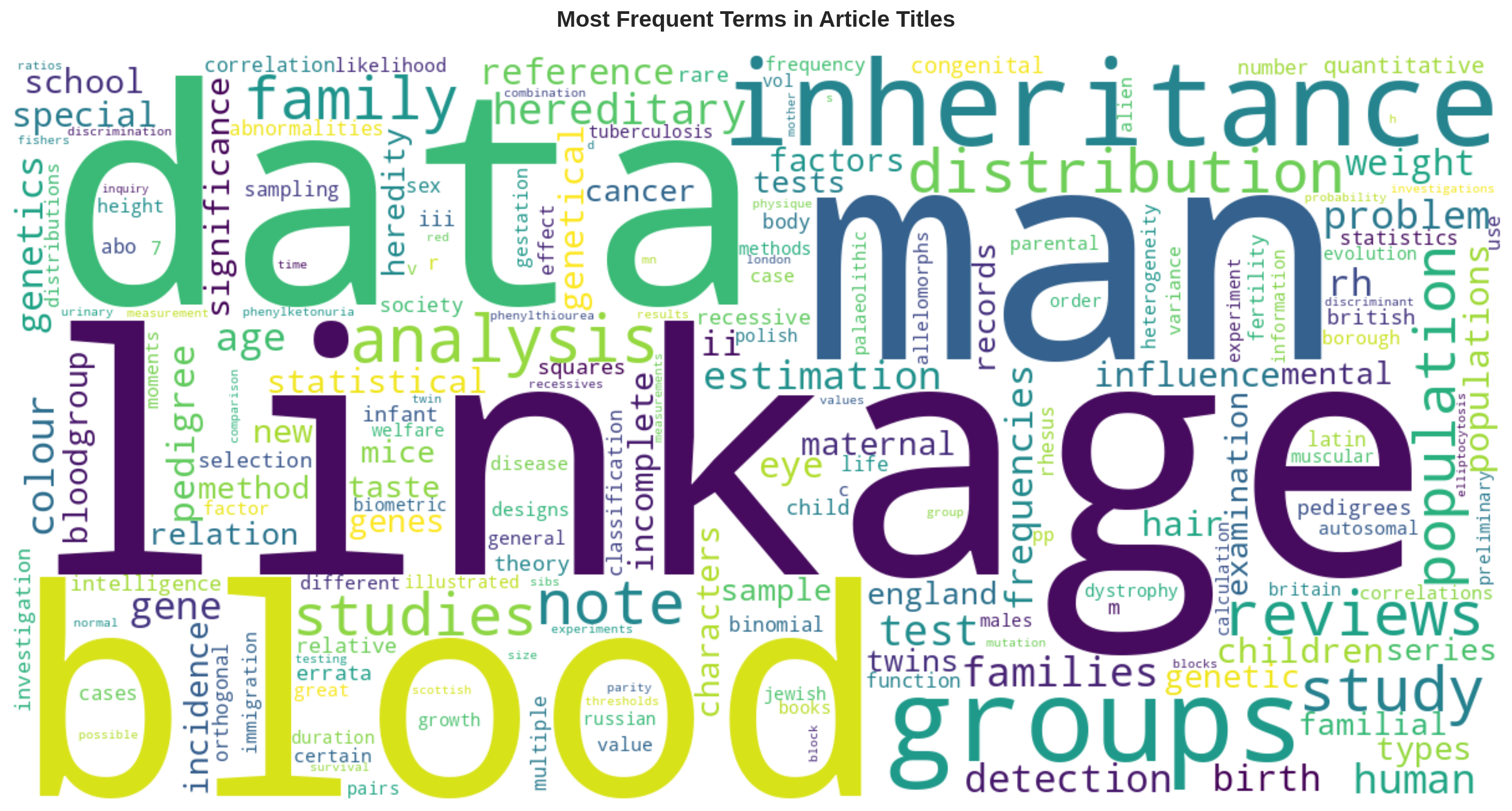 Key Findings: - Terms like “inheritance,” “genetics,” “correlation,” and “blood” dominate - Statistical and quantitative language is prominent (“frequency,” “data,” “analysis”) - Mix of biological/genetic terms and mathematical/statistical terminology reflects the journal’s interdisciplinary nature